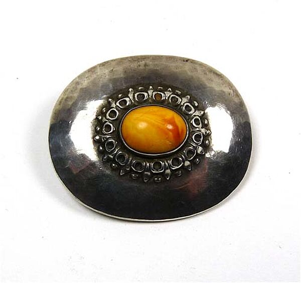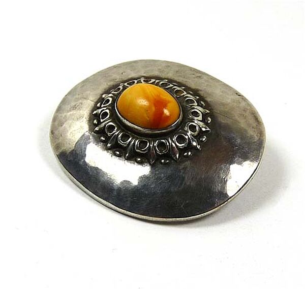 Handgetriebener, hohl gebödeter, querovaler, konvexer Silberkorpus (800er) mit feinem Hammerschlagdekor, der mittig einen erhöhten, querovalen, gelblichen, opaken Bernstein-Cabochon in Zargenfassung trägt. Dieser wird von Reihen aufgesetzter Ring-, Punkt- und länglich-rhombenförmigen Elementen umrahmt. Maße ca. 4,5 x 3,7 cm, ungeputzter Zustand mit diskreter Patina und geringen Tragespuren. Rückseitig einfache Broschierung und Markung, wohl um 1915.