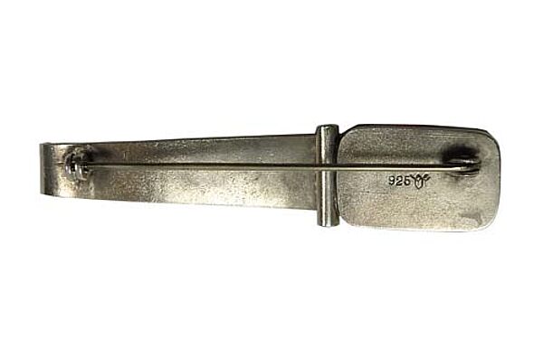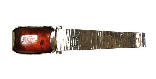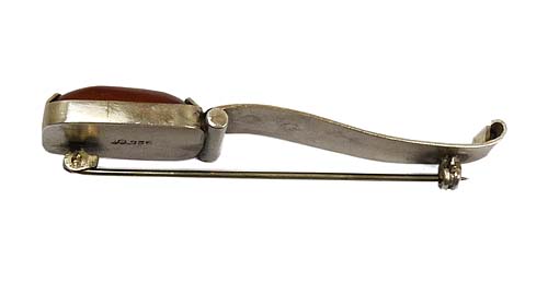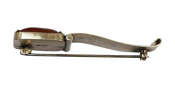 Der handgearbeitete, längliche, fibelartige Silberkorpus (925er) trägt quasi als Kopf einen luziden, braunen Bernsteincabochon in Zargenfassung mit zwei zusätzlichen Krappen. Länge ca. 6,2 cm, Maße des Bernsteins ca. 1,8 x 1,2 cm, ungeputzter Zustand mit geringen Tragespuren. Rückseitig Markung und Sicherheitsverschluss mit Kugelkopf. Wohl 20er, 30er Jahre.