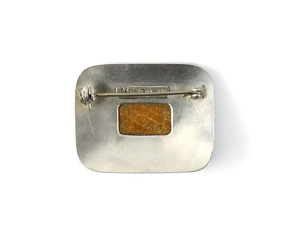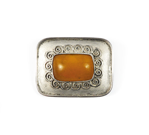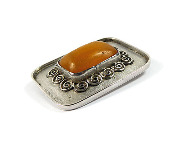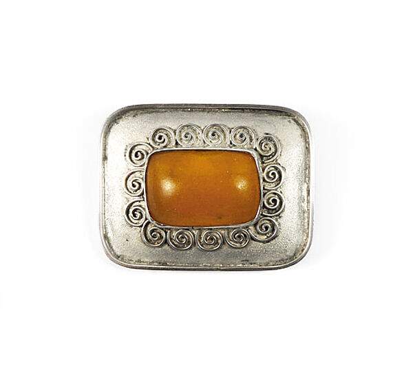 Querrechteckiger Silberkorpus (835er) mit abgerundeten Ecken, mittig rechteckiger, opaker, orange-farbener Bernsteincabochon in Zargenfassung, die von kleinen aufgesetzten Spiralelementen umgeben ist. Maße ca. 3,7 x 2,8 cm, ungeputzter Zustand mit leichter Patina und geringen Tragespuren. Rückseitig Sicherheitsbroschierung mit Kugelkopf und Markung (ungedeutet). Wohl Deutschland der 1920er bis 40er Jahre.
