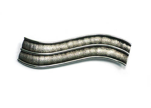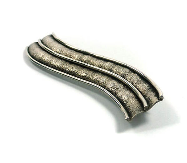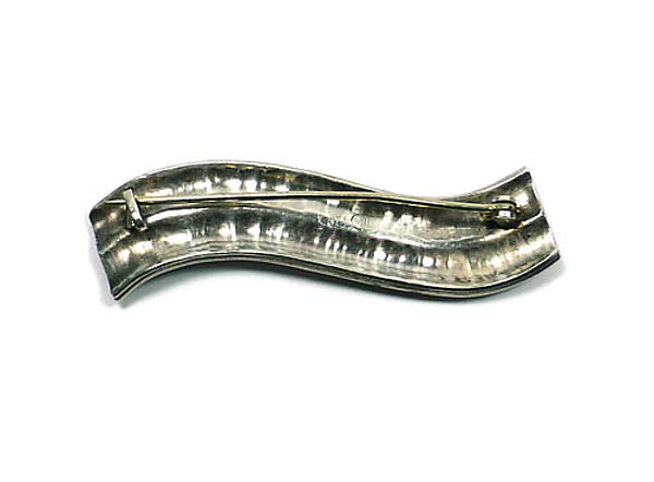 Flach S-förmiger, bandartiger Silberkorpus (935er), dessen Oberseite durch zwei am Rand und einen mittig verlaufenden Steg geteilt wird. Die dazwischen liegende Fläche wirkt fein punziert. Länge ca. 6 cm, ungeputzter Zustand mit leichter Patina und geringen Tragespuren. Rückseitig einfache Broschierung und Markung. Wohl Mitte / Ende der 1930er Jahre.