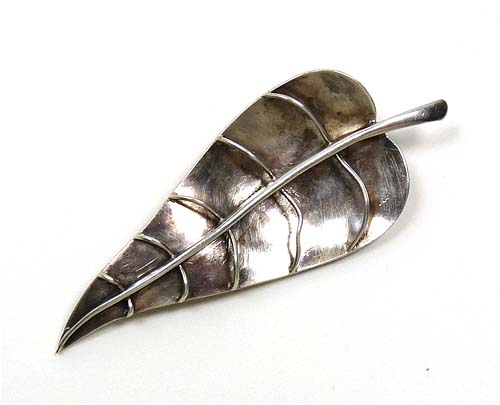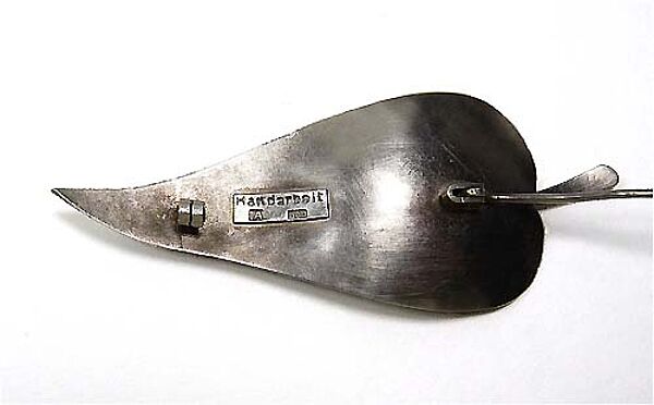 Handgetriebener, leicht gewölbter Silberkorpus (800er) in Form eines stilisierten Blattes, wobei Stiel und Aderung durch separierte, netzartig über die Fläche gespante Stege bzw. Drähte symbolisiert werden. Länge ca. 7 cm, ungeputzter Zustand mit diskreter Patina und geringen Tragespuren. Rückseitig einfache Broschierung, ungedeutete Markung ("A") und Bezeichnung "Handarbeit". Wohl Deutschland der 30er bis 50er Jahre.