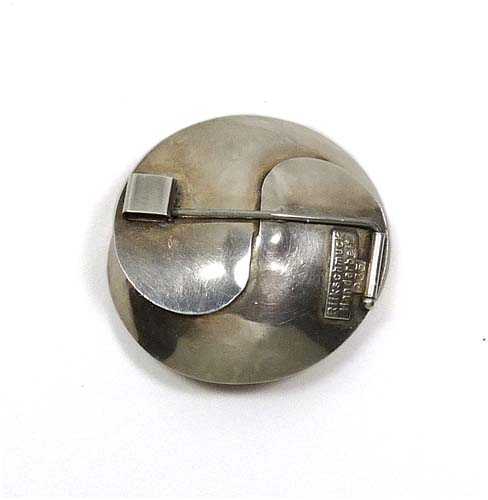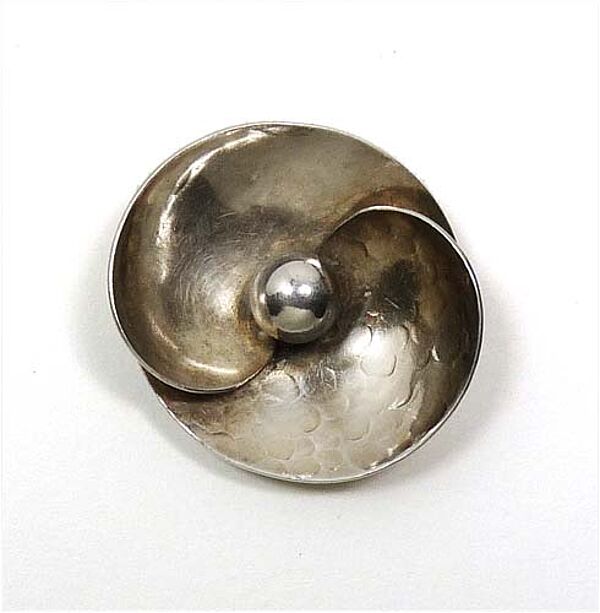 Handgefertigter Silberkorpus (935er) in Form einer stilisierten Blüte, mittig perlenfötmigrs Silberelement. Durchmesser ca.3,7 cm, ungeputzter Zustand mit geringen Tragespuren. Rückseitig Sicherheitsbroschierung mit flacher Hülse und Markung. Wohl 30er Jahre.