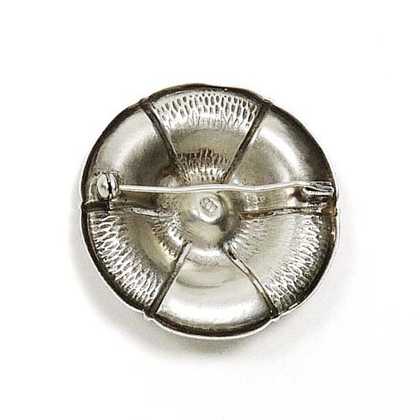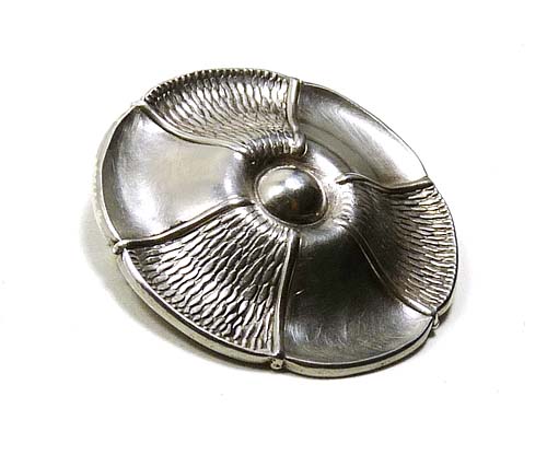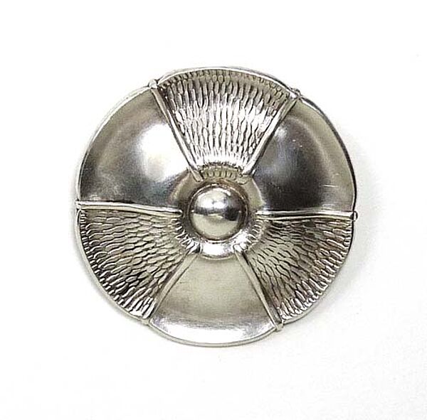 Runder, leicht gewölbter Silberkorpus in Form einer stilisierten, sechsblättrigen Blüte. Durchmesser ca. 4 cm, ungeputzter Zustand mit geringen Tragespuren. Rückseitig Sicherheitsbroschierung mit Kugelkopf. Ungemarkt, wohl Deutschland der 20er, 30er Jahre.