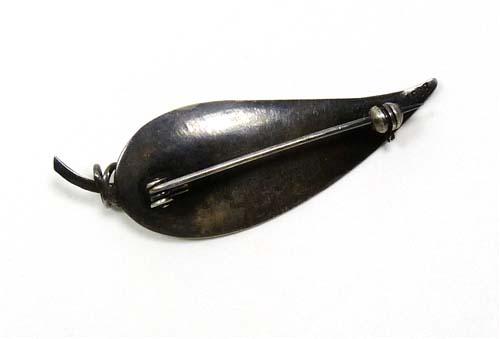 Silberner (835er) Korpus in Form eines stilisierten, leicht konkav gewölbten Blattes. Länge ca. 5,6 cm, ungeputzter Zustand mit deutlicherer Patina und geringen Tragespuren. Rückseitig Sicherheitsbroschierung mit Kugelkopf. Ungemarkt, wohl Deutschland der 20er, 30er Jahre.