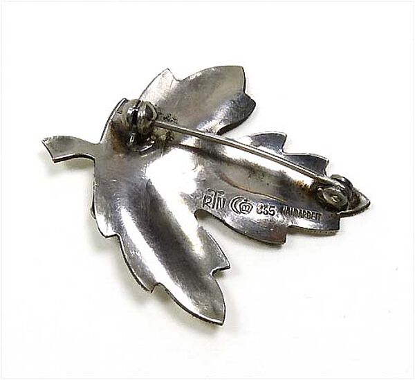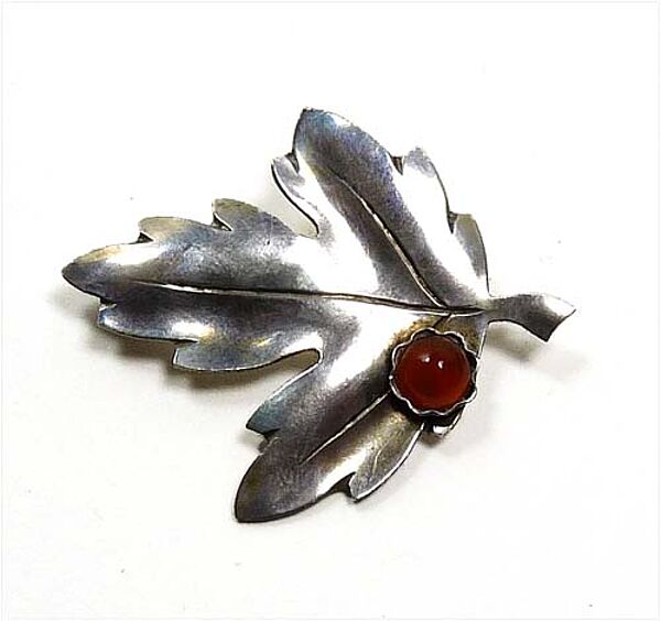 Silberner (835er) Korpus in Form eines Ahornblattes mit aufgesetztem roten Cabochon (Granat?) in Zargenfassung. Maße ca. 4,2 x 3,5 cm, ungeputzter Zustand mit leichter Patina und geringen Gebrauchsspuren. Rückseitig Markung, Bezeichnung "HANDARBEIT" und Sicherheitsbroschierung mit Kugelkopf. Wohl 20er, 30er Jahre