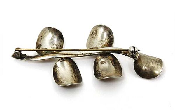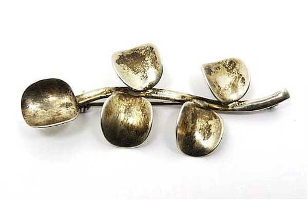 Silberner Korpus (835er) in Form eines stiliserten Zweiges bzw. einer stilisierten Rispe mit 5 Blättern. Länge ca. 7,2 cm, ungeputzter Zustand mit ungleichmäßiger Patina und geringen Tragespuren. Rückseitig Sicherheitsbroschierung mit Kugelkopf. Ungemarkt, wohl Deutschland oder Skandinavien der 50er, 60er Jahre.
