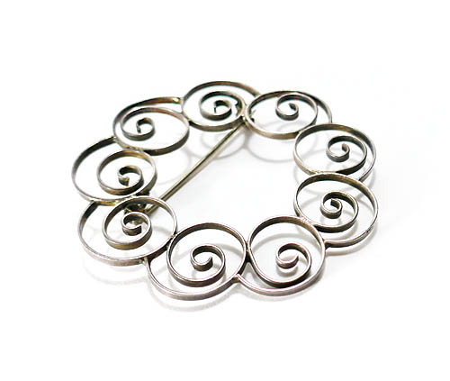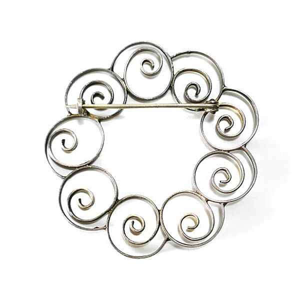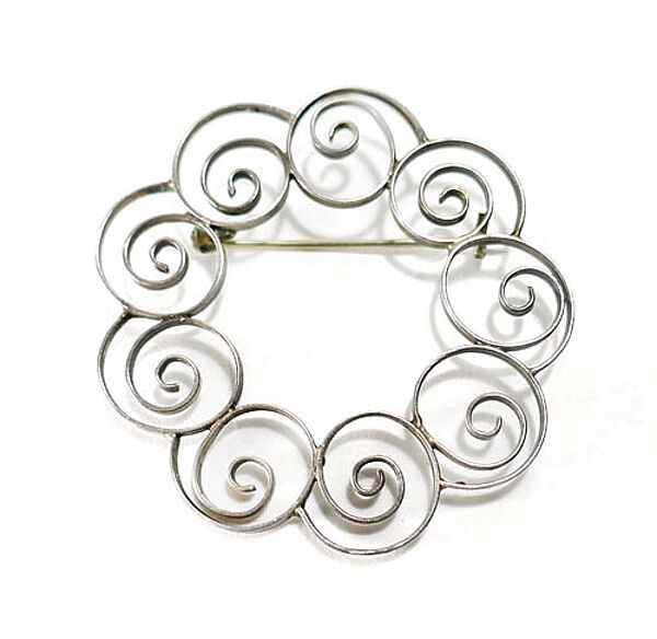 Handgefertigter Silberkorpus (800er) in Form eines ringförmig angeordneten Reigens schneckenförmig gedrehter, feiner Drahtelemente. Durchmesser ca. 4,6 cm, ungeputzter Zustand mit geringen Tragespuren. Rückseitig einfache Broschierung. Seitlich Signet. Wohl 1920er, 30er Jahre.