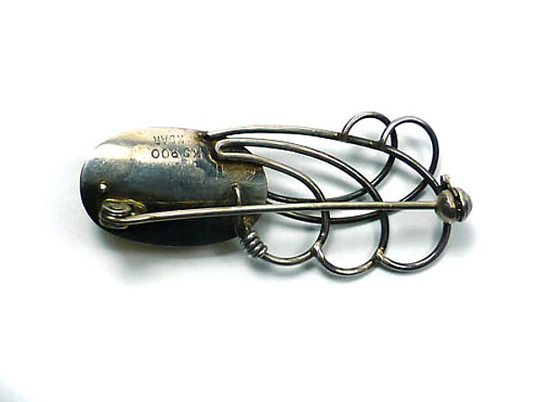 Silberner Korpus (900er) mit abstrahiert-vegetabiler Form: fünf verschlungene, an Stengel erinnernde Drähte vereinen sich an einer Seites eines ovalen, gemuldeten Elementes, welches drei aufgefädelte, gelbe Glasperlen trägt. Länge ca. 4,5 cm, ungeputzter Zustand mit moderater Patina und geringen Tragespuren. Rückseitig Markung "KS" (ungedeutet), Bezeichnung "Handarbeit" und Sicherheitsverschluss mit Kugelkopf. Wohl Deutschland der 1920er, 30er Jahre.