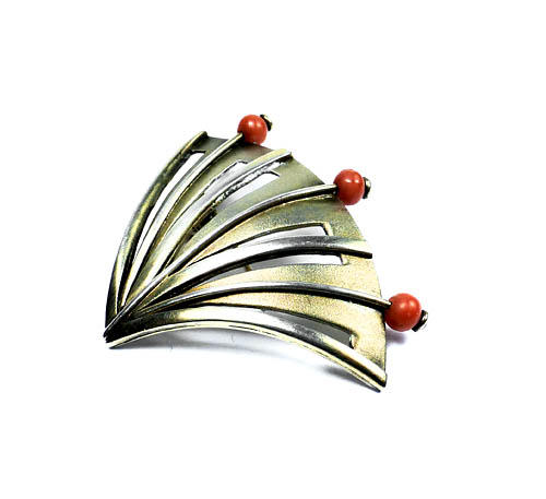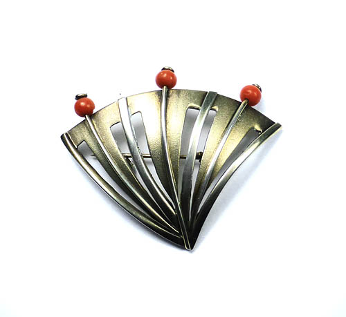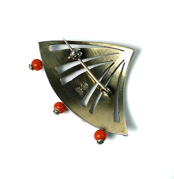 In der Grundform annähernd dreieckiger, leicht gewölbter Silberkorpus (835er), bei dem sich - fächerförmig angeordnet - sechs bandförmige Schlitzungen mit sieben aufgelegten Stegen abwechseln, drei hiervon werden von Korallenperlen gekrönt. Maximale Breite ca. 4,6 cm, geringe, etwas ungleichmäßige Patina, leichte Tragespuren. Rückseitig Sicherheitsverschluss mit Kugelkopf und undeutliche Markung. Wohl Deutschland oder Österreich der 1920er Jahre.