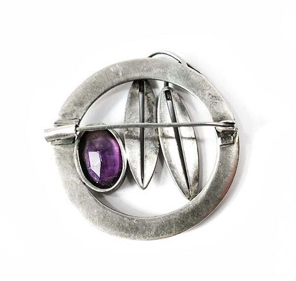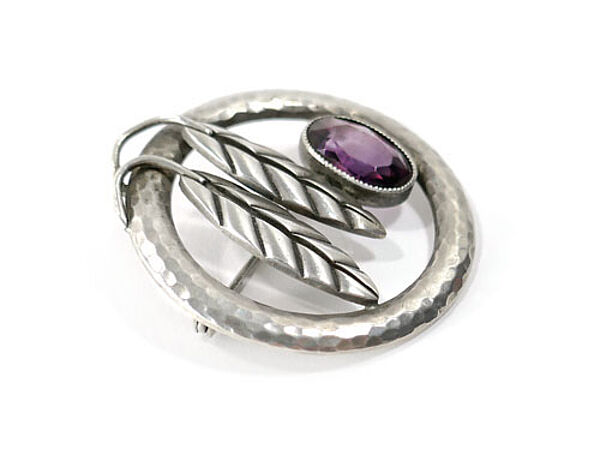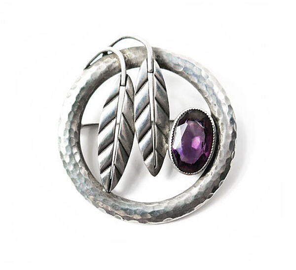 Runde, offen gearbeitete Silberbrosche (935er): ein martellierter Reif umgibt zwei längliche, stilisierte Blätter und einen zargengefassten, facettierten Amethyst. Durchmesser ca. 3,5 cm, ungeputzter Zustand mit diskreter Patina und geringen Tragespuren. Rückseitig einfache Broschierung. Ungemarkt, wohl Deutschland der 1920er Jahre.