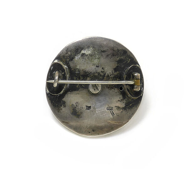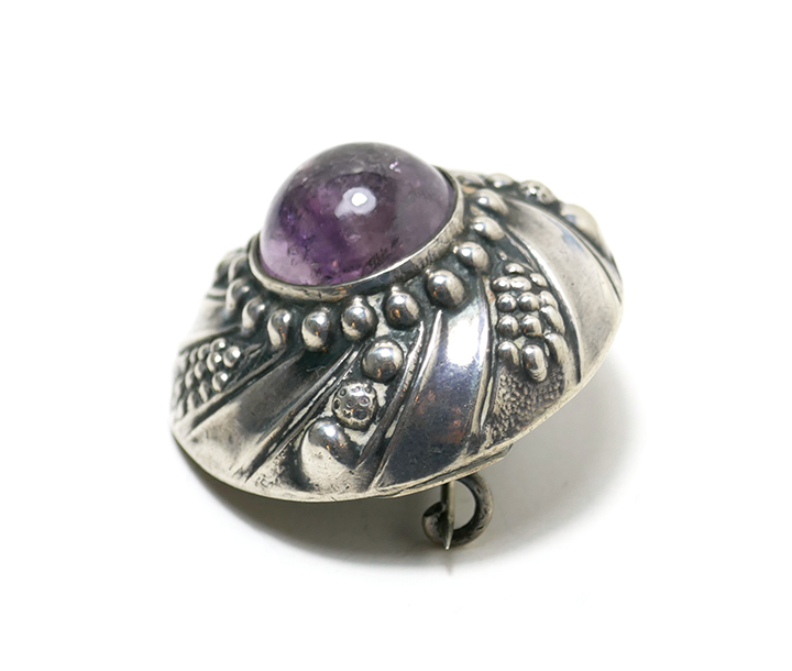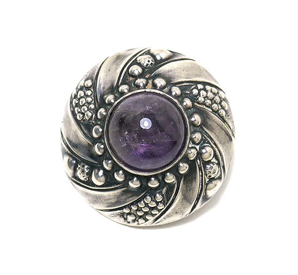 Hohl gebödeter, annähernd halbkugelförmiger Silberkorpus (800er). Mittig befindet sich ein runder Amethyst-Cabochon in Zargenfassung, die außen mit einem Perlrand verziert ist. Hiervon ausgehend, ist die Oberfläche mit einem spiralig angelegten, halbplastischen Dekor versehen, welches aus abwechselnd Streifenelementen und Reihen von kleinen Halbkugeln besteht. Durchmesser knapp 3 cm, ungeputzter Zustand mit teilweise dunkler Patina und geringen Tragespuren. Rückseitig einfache Broschierung und Markung, vermutlich um 1915.