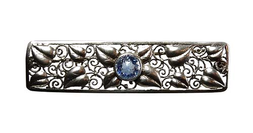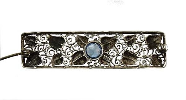 Rechteckiger, fast bandförmiger, offen gearbeiteter Silberkorpus (835er) der aus einem filigranen Blätter- und Rankenwerk besteht, zentral befindet sich ein runder, facettierter Aquamarin in Zargenfassung. Rückseitig Sicherheitsbroschierung mit Kugelkopf. Maße ca. 5,8 x 1,5 cm, Steindurchmesser ca. 8mm, geputzter Zustand mit geringen Gebrauchsspuren. Unbezeichnet, wohl Deutschland oder Österreich der 20er Jahre.