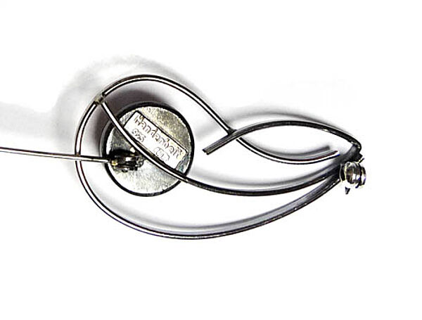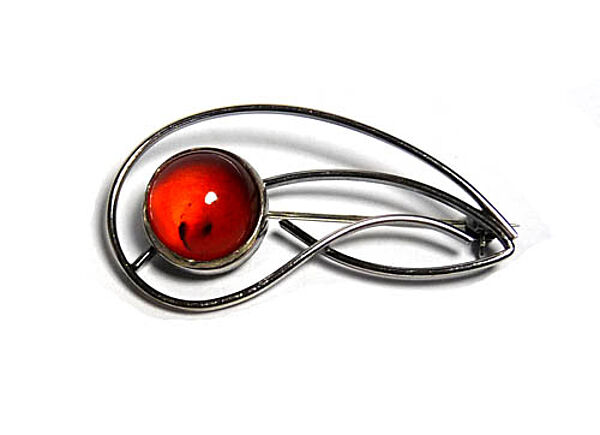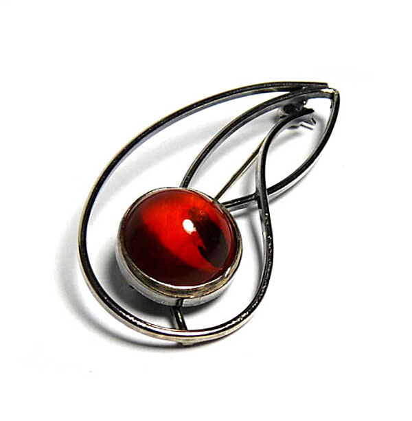 Offen gearbeiteter, filigraner Silberkorpus (925er), in der Grundform an ein Auge oder Blatt erinnernd, ein luzider orange-brauner, runder Bernstein-Cabochon in Zargenfassung ist asymmetrisch integriert. Länge ca. 4,7, Breite ca. 2,5 cm, ungeputzter, vermutlich ungetragener Zustand. Rückseitig Sicherheitsverschluss mit Kugelkopf und Markung, wohl 1930er Jahre.