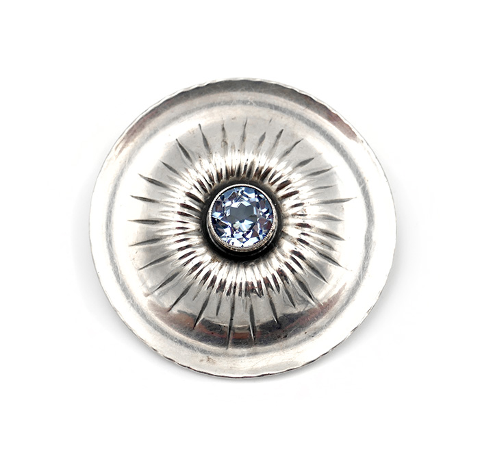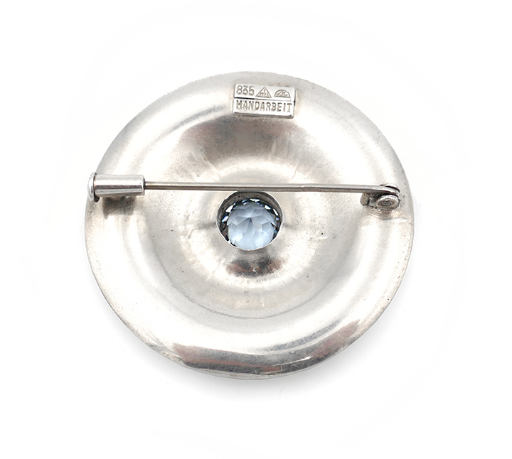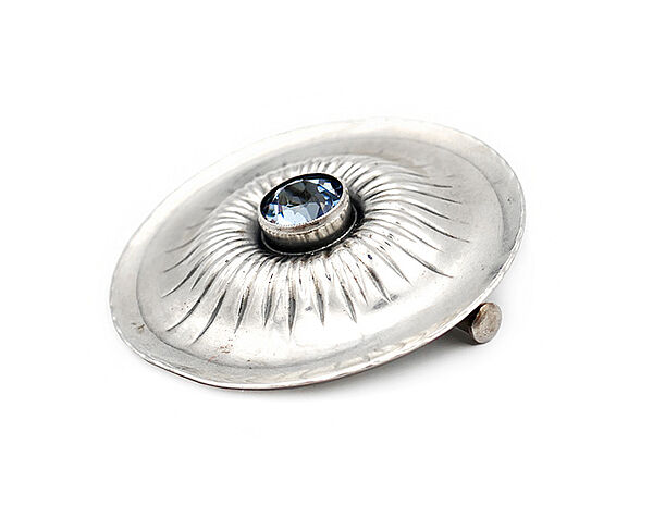 Scheibenförmiger, vom Rand zur Mitte leicht gewellt verlaufender Silberkorpus (835er). Zentral ist ein facettiert geschliffener, hellblauer Schmuckstein (Blautopas) in Zargenfassung fixiert. Hiervon strahlenförmig ausgehendes, gepunztes Linienmuster. Durchmesser ca. 4 cm, minimale Tragespuren. Rückseitig Sicherheitsbroschierung mit schiebbarer Zylinderhülse, Markung und Laurinsiegel (= Zusatzsiegel für hervorragende Qualität von 1934 - 1938).