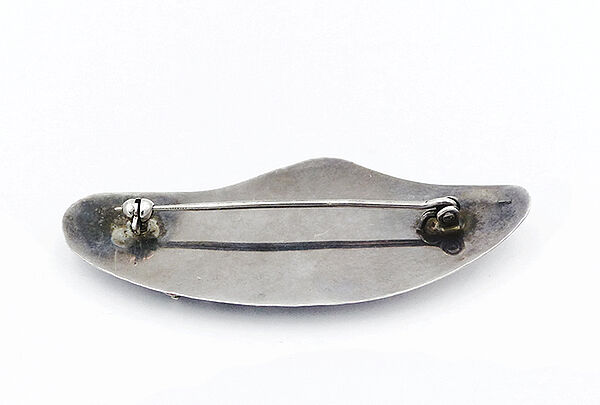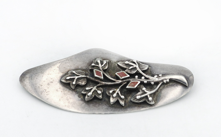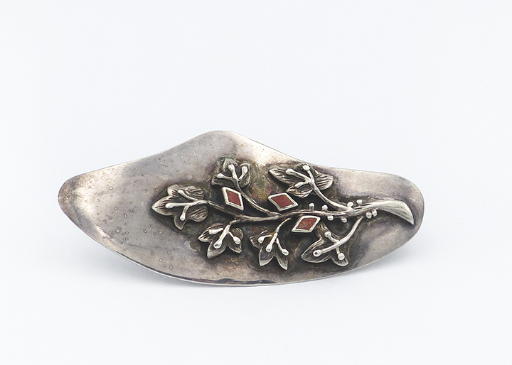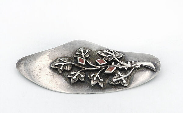 Annähernd ovaler, unregelmäßig "organisch" konturierter, flacher Silberkorpus (925er). Oberseitig aufgelegtes, flach-plastisches Dekor in Form eines stark stilisierten Zweiges mit drei roten Früchten (diese werden durch drei kleine, zargengefasste rote Schmucksteine wiedergegeben). Maße ca. 6 x 2,5 cm, ungeputzter Zustand mit leichter Patina und geringen Tragespuren. Rückseitig Sicherheitsbroschierung mit Kugelkopf. Wohl Deutschland der 1950er Jahre.