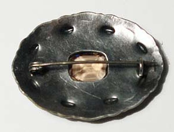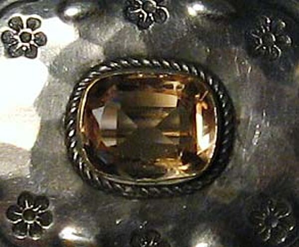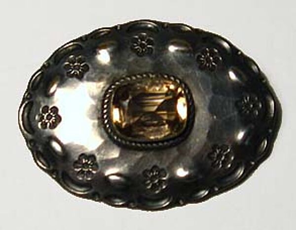 Querovaler, handgetriebener Silberkorpus (geprüft) mit gepunztem Blütendekor und mittig integriertem, facettierten, gelblichen Stein in Zargenfassung mit umlaufenden Kordelelement, wobei der Korpus hier rückseitig geöffnet ist. Breite ca. 50 mm, ungeputzter Zustand mit leichter Patina und geringen Tragespuren. Rückseitig einfache Broschierung. Ungemarkt, wohl Deutschland der 20er Jahre.