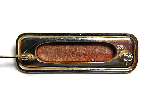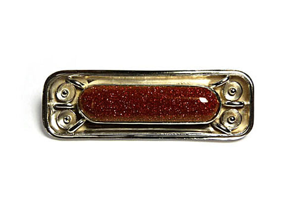 Leicht gemuldeter, bandförmiger, handgearbeiteter Silberkorpus (935er) mit abgerundeten Ecken. Mittig befindet sich ein länglicher Goldfluss-Cabochon (= Aventuringlas). An den Ecken sind vier Halbschalenelemente mit kleinen Kügelchen und feine Drahtstege fixiert. Länge ca. 5,7 cm, Breite ca. 2 cm. Rückseitig Sicherheitsverschluss mit Kugelkopf. Ungemarkt, stilistisch aber ziemlich sicher einem Entwurf von Tini Riik der 1930er Jahre zuzuordnen.