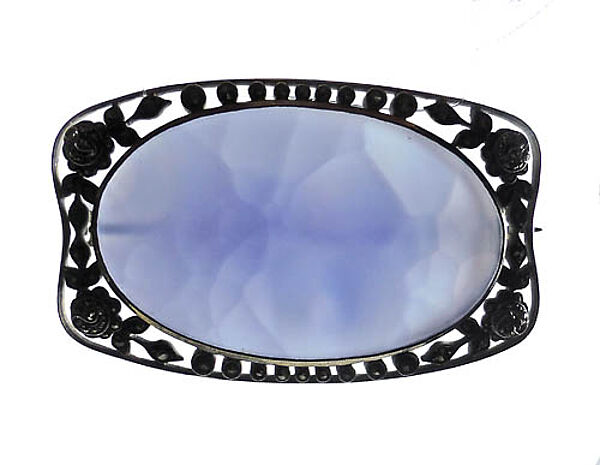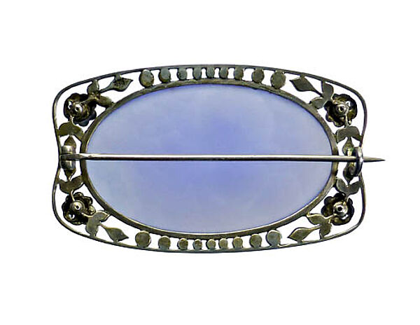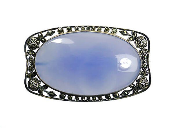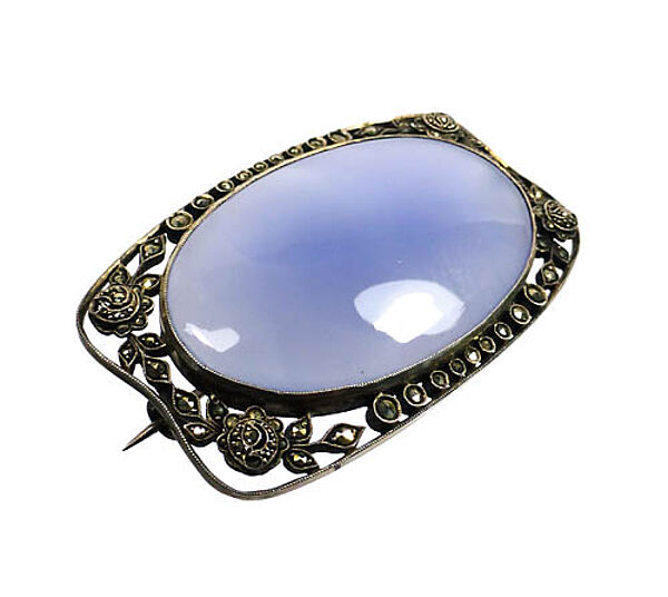 Handgefertigter, annähernd rechteckiger Silberkorpus (935er) mit abgerundeten Ecken und flach-konvexer Wölbung der langen bzw. flach-konkaver Einziehung der kurzen Seitenkanten, die von einem durchbrochenen, filigran gearbeiteten, stilisiert-floralen, Markasit-besetzten Rand begleitet werden. Mittig ist ein großer, hellblauer Chalcedon in Zargenfassung integriert, der eine leicht wolkige Textur aufweist (in der Gegenlichtaufnahme sichtbar). Maße ca. 6 x 3,5 cm, Cabochon ca. 5 x 3 cm, ungeputzter Zustand mit teils dunkler Patina, leichte tragespuren. Rückseitig einfache Broschierung. Ungemarkt, wohl Deutschland um 1915 bis 25.