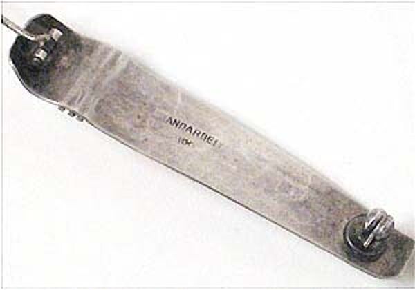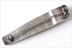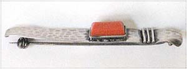 Der längliche, annähernd bandförmige, angedeutet wellenartig gewölbte und an einer Seite leicht verjüngte Korpus aus getriebenem Silber (800er) erinnert an eine Fibel. Vorderseitig wirkt der Hammerschlag als Dekor. Asymmetrisch sind eine rechteckige Koralle in Zargenfassung sowie drei kleine Silberstege aufgebracht. Länge ca. 6,3 cm, ungeputzter Zustand mit leichter Patina und geringgradigen Gebrauchsspuren. Rückseitig Sicherheitsbroschierung mit Kugelkopf sowie Bezeichnung "HANDARBEIT". Ungemarkt, wohl Deutschland oder Österreich der 1920er Jahre.
