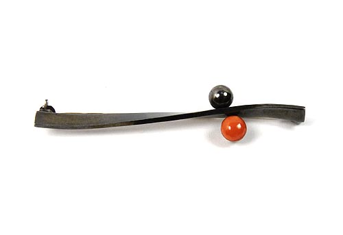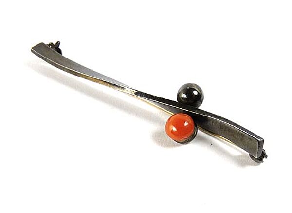 Bandförmiger, in sich verdrehter Silberkorpus (935er). Am äußeren Drittel sind auf der einen Seite ein silbernes Kugelelement und auf der anderen Seite eine Korallenperle in einen flachen Zargenfassung fixiert. Länge ca. 6,5 cm, ungeputzter Zustand mit fast homogener, dunkler Patina und geringen Tragespuren. Rückseitig Sicherheitsverschluss mit Kugelkopf. Ungemarkt, wohl Deutschland der 1920er Jahre.