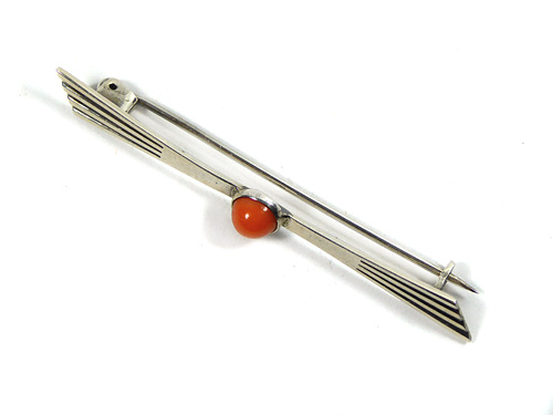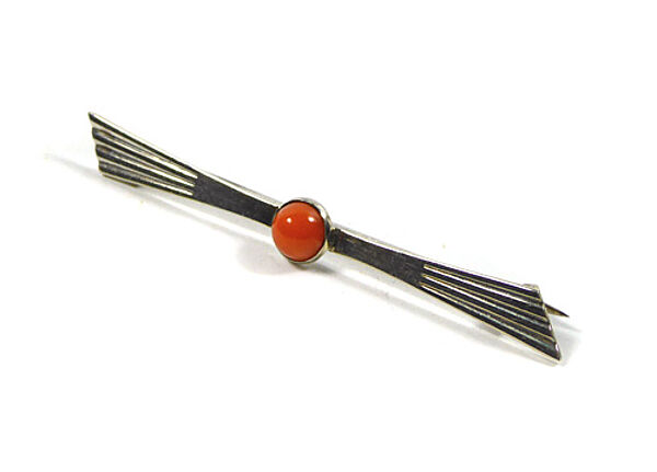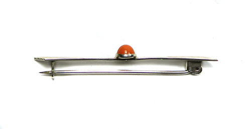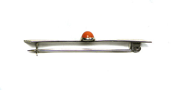 Bandförmiger Silberkorpus (800er), der sich jeweils seitlich leicht erweitert, hier streifenförmige Punzung. Mittig rote Korallenhalbperle in Zargenfassung. Länge ca. 5,3 cm, ungeputzter Zustand mit leichten Tragespuren. Rückseitig einfache Broschierung. Ungemarkt, wohl Deutschland der 1920er bis 40er Jahre.