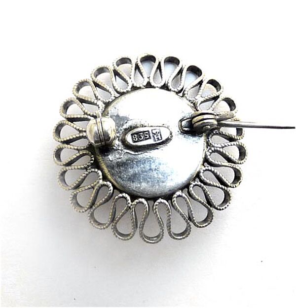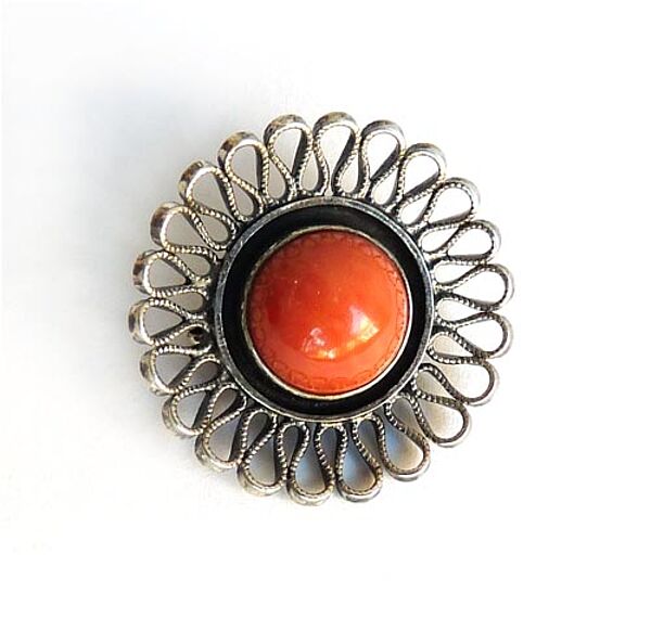Silberner Korpus (835er) in Form einer stiliserten Blüte, wobei der Rand aus schlaufenartig konfiguriertem Silberdraht gebildet wird, das scheibenförmige Zentrum ist durch einen relativ kräftigen Steg begrenzt, mittig Korallen-Cabochon in Zargenfassung. Durchmasser ca. 3 cm, ungeputzter Zustand mit geringen Tragespuren. Rückseitig Sicherheitsbroschierung mit Kugelkopf. Hier auch Markung, wohl 1920er bis 50er Jahre.