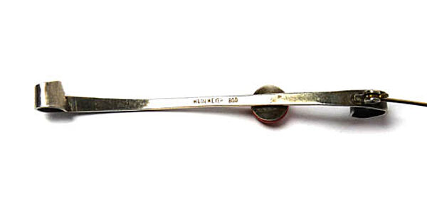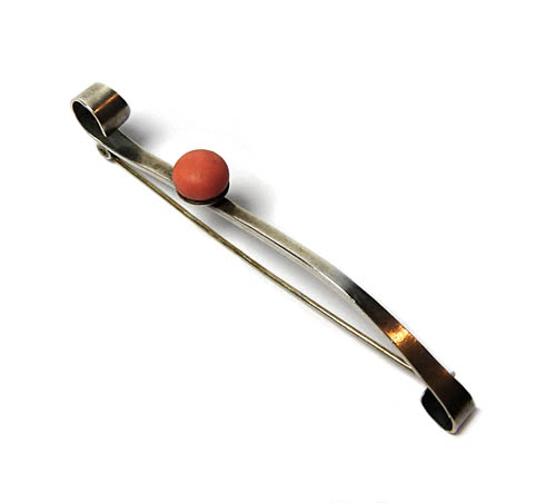 Eleganter, länglicher, fibelartiger Silberkorpus (800er) mit gegensinnig aufgerollten Enden. Am Übergang des einen äßeren zum mittleren Drittel ist auf einer kleinen Schale eine Korallenperle aufgesetzt. Länge ca. 7,2 cm. Ungeputzter Zustand mit leichter Patina und geringen Tragespuren. Rückseitig einfache Broschierung und Markung, wohl 20er, 30er Jahre.