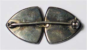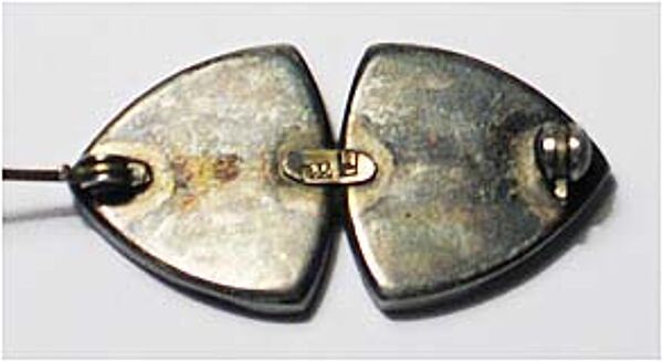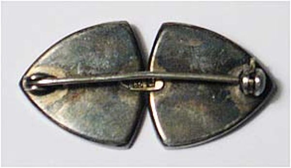 Der Silberkorpus (835er) ist unterteilt in zwei sich tangierende, annähernd dreieckige Grundformen mit leicht konvexer Kantenwölbung. Zentral befindet sich jeweils ein roter Cabochon (vermutlich Koralle) in Zargenfassung, der von drei aufgesetzten stilisiert-herzförmigen Elementen umgeben ist. Länge ca. 3,8 cm, ungeputzter Zustand mit deutlicherer, fast gleichmäßiger Patina. Rückseitig Markung und Sicherheitsbroschierung mit Kugelkopf, wohl 1920er Jahre.
