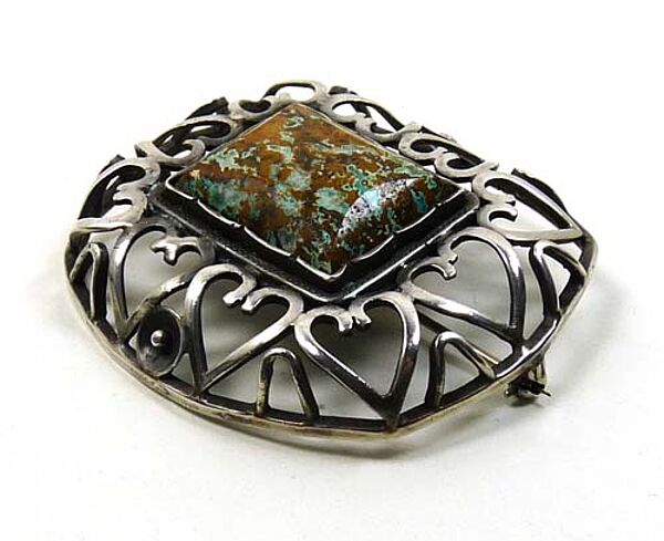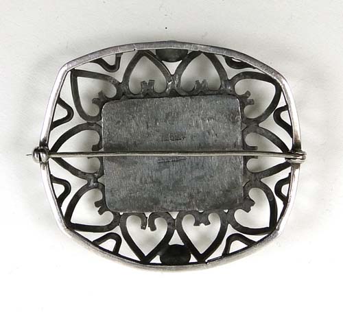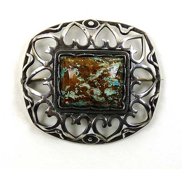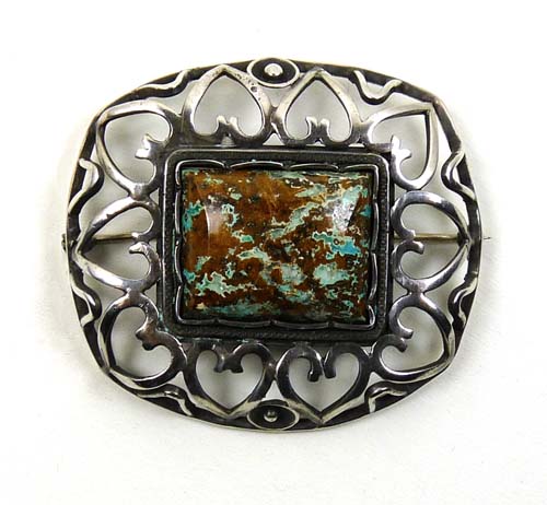 Offen gearbeiteter, gewölbter, annähernd rechteckiger Silberkorpus mit abgerundeten Ecken und leicht konvex verlaufenden Seitenkanten: ein schmaler Steg ist die Basis für eine Reihe von Herzen, die wiederum einen rechteckigen, gemuggelten Landschaftsjaspis (?) in Zargenfassung umschließen. Broschenmaße ca. 5 x 4,5 cm, ungeputzter Zustand mit geringen Tragespuren. Rückseitig Sicherheitsbroschierung mit Kugelkopf sowie Bezeichnung "sterling" und "handmade". Evtl. England der 20er Jahre.