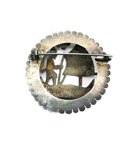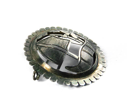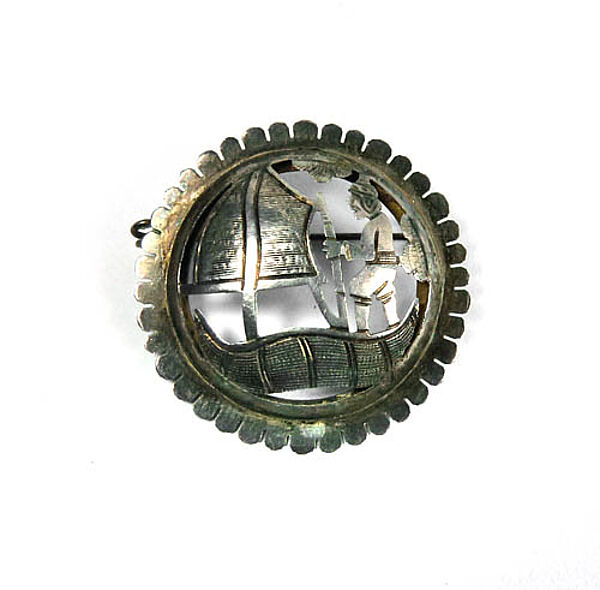 Runder, konvex gewölbter, handgesägter und gepunzter Silberkorpus (geprüft) mit dem Motiv eines in einem Seglerboot stehenden Mannes (Kriegers?). Bogenförmige Zierkante. Durchmesser ca. 3 cm, ungeputzter Zustand mit leichter Patina und geringen Tragespuren. Rückseitig einfache Broschierung. Ungemarkt, wohl Mexiko der 20er, 30er Jahre.
