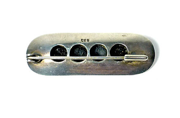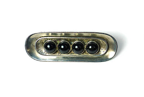 Silberkorpus (835er) aus zwei übereinander liegenden, länglichen, an den Ecken abgerundeten Schalen-Elementen, wobei das obere bzw. kleinere ein feines, gepunztes Dekor aus zarten Ringen aufweist und eine Reihe von vier perlenartigen Onyx-Cabochons in Zargenfassung integriert hat. Länge der Brosche ca. 4,5 cm, Durchmesser der Cabochons ca. 5 mm. Ungeputzter Zustand mit leichter Patina und geringen Tragespuren. Rückseitig einfache Broschierung. Ungemarkt, wohl Deutschland der 1920er, 30er Jahre.