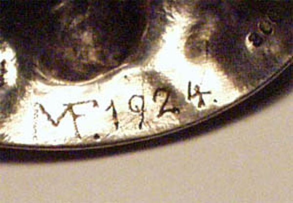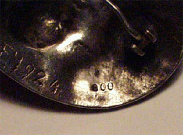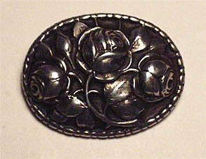 Ovaler Silberkorpus (800er) mit plastischem Rosendekor. Maße ca. 4 x 3,3 cm, ungeputzter Zustand mit moderater Patina und geringen Tragespuren. Rückseitig einfache Broschierung sowie eingeritzte Widmung "MF 1924". Wohl Deutschland der 20er Jahre.
