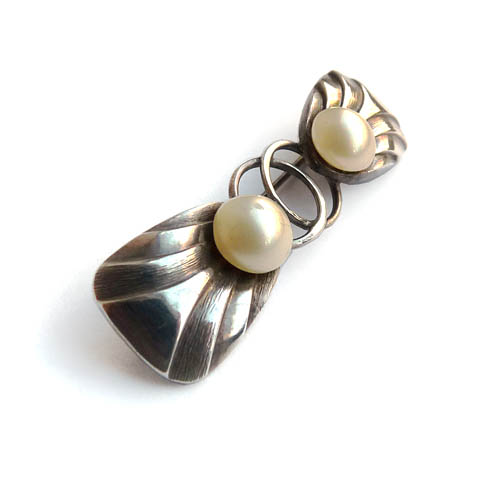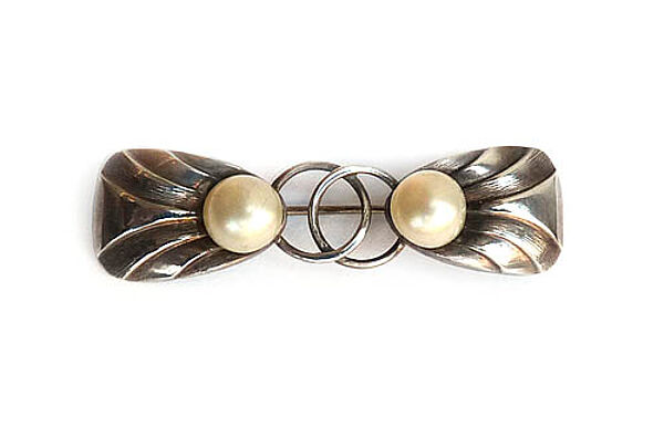 Silberner Korpus (835er), der sich aus zwei äußeren, blattartigen und zwei inneren ringförmigen Elementen zusammensetzt, im Übergang vom jeweils äußeren zum mittleren Drittel ist je eine Wachsperle fixiert. Länge ca. 5 cm, ungeputzter Zustand mit leichter Patina und geringen Tragespuren. Rückseitig eigentlich Sicherheitsbroschierung mit Kugelkopf, vom letzteren fehlt aber der Schieber, so dass es sich derzeit "nur" um eine einfache Broschierung handelt. Unsigniert, wohl Deutschland der 20er Jahre.