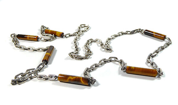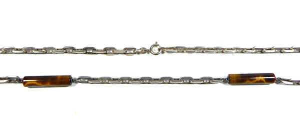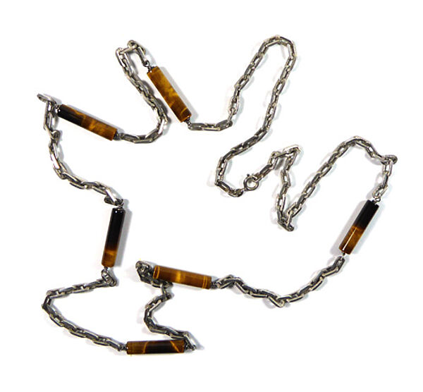 Silberkette (835er) aus kräftigen Gliedern (annähernd Bostonkette), zudem hier sind 6 walzenförmige Elemente aus Tigerauge (jeweils Durchmesser ca. 0,5 cm, Länge ca. 2,5 cm) eingefügt, Ringösenverschluss. Gesamtkettenlänge ca. 90 cm, ungeputzter Zustand mit leichter Patina und geringen Tragespuren. Wohl Deutschland der 1920er, 30er Jahre.