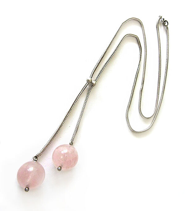 Silberne, zarte Fuchsschwanzkette (925er) mit Ringösenverschluss und zwei losen Enden, die jeweils mit einer gestifteten Rosenquarz-Perle abschließen. Die Kette läuft durch ein kleines, aus zwei Kugeln gebildetes Element, so dass sie hierdurch zusammengehalten wird und die Länge der losen Kettenanteile variierbar ist. Länge ca. 57 cm, ungeputzter Zustand mit diskreter Patina und leichten Tragespuren. Ungemarkt, der Kettentypus ist aber bekanntermaßen Toni Riik zuzuordnen, s.a. auf unserer Homepage Art.Nr. 7444. Wohl Anfang der 1930er Jahre.