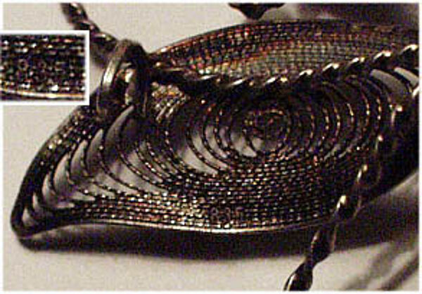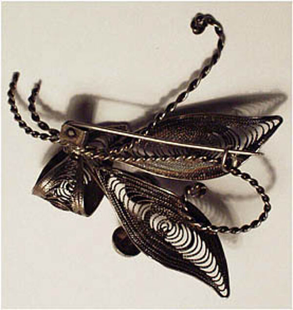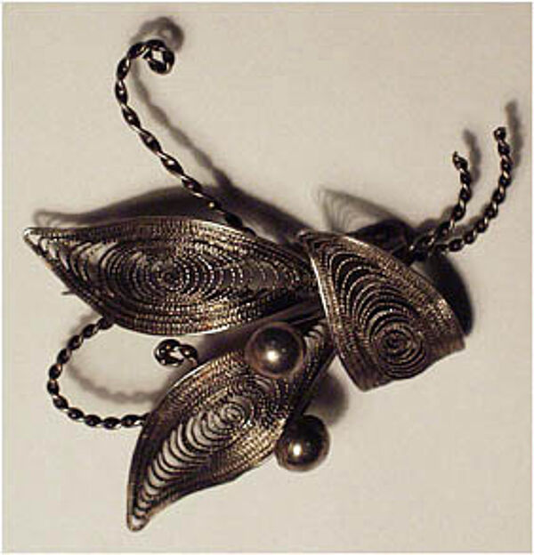 Silberner Korpus (835er), der aus Filigrandrähten in Form einer bizarren Blüte aufgebaut ist. Maße ca. 5,7 x 4,5 cm, ungeputzter Zustand mit relativ dunkler Patina und geringen Tragespuren. Rückseitig einfache Broschierung. Ungemarkt, wohl Deutschland der 20er, 30er Jahre.