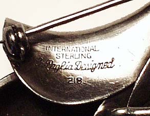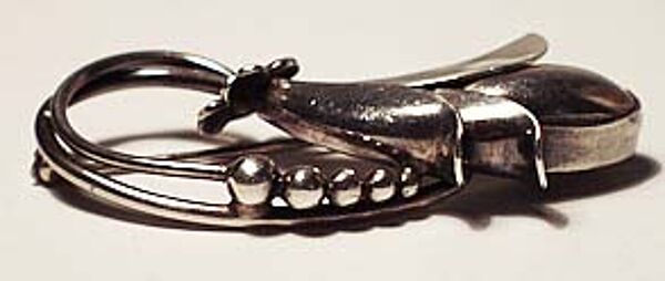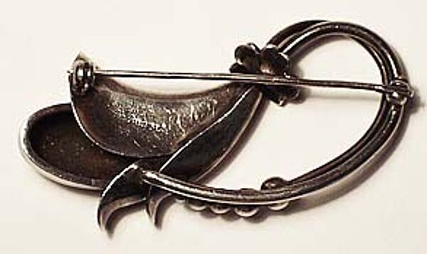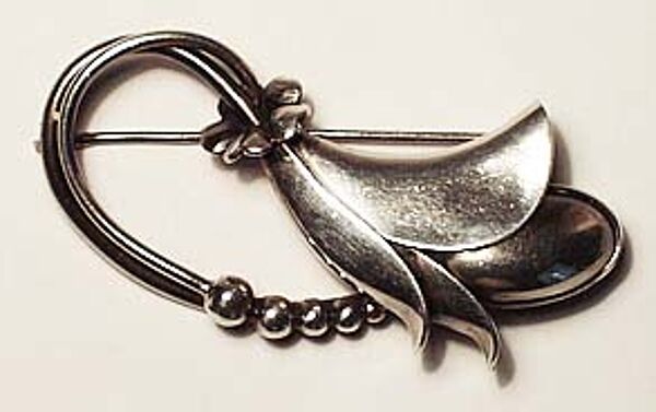 Relativ großer, schwerer Silberkorpus in Form einer stilisierten Blume, deren Stengel zur Blüte gebogen ist. Länge ca. 6 cm, ungeputzter Zustand mit geringen Tragespuren. Rückseitig Sicherheitsbroschierung mit Kugelkopf sowie Bezeichnung: "INTERNATIONAL STERLING La Paglia Designed 218" (ungedeutet, evtl. Dänemark der 20er Jahre für den amerikanischen Markt??), der Entwurf erinnert an Georg Jensen.