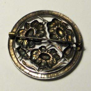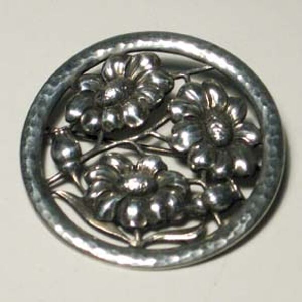 Scheibenförmiger, offen gearbeiteter Korpus aus getriebenem Silber (800er), wobei ein martellierter Rand drei kraftvoll gestaltete Blumen bzw. Blüten umrahmt, Durchmesser ca. 4,2 cm. Rückseitig einfache Broschierung. Ungeputzter Zustand mit diskreter Patina bzw. minimalen Gebrauchsspuren. Ungemarkt, wohl Deutschland der 20er, 30er Jahre.