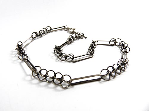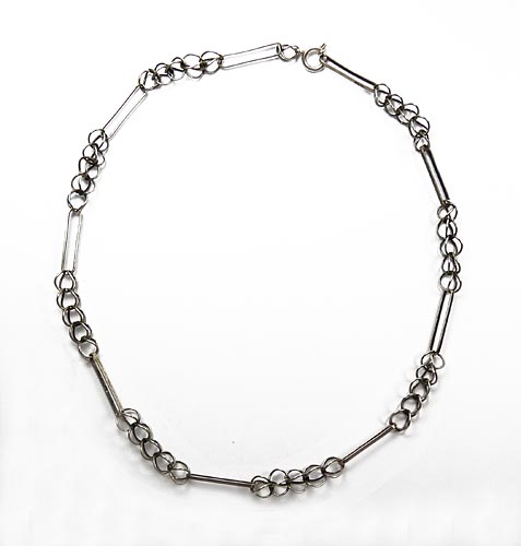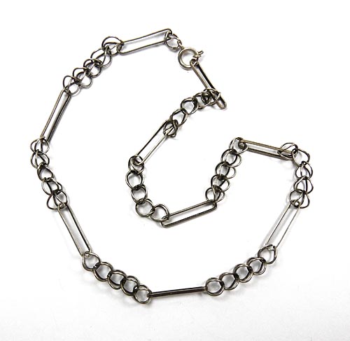Kette aus abwechselnd schienenförmigen und spährischen, silbernen Elementen (800er), Ringösenverschluss. Länge ca. 41,5 cm, ungeputzter Zustand mit leichter Patina und geringen Gebrauchsspuren. Ungemarkt, wohl Deutschland der 20er Jahre.