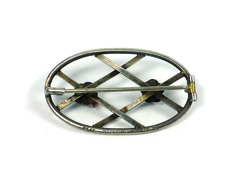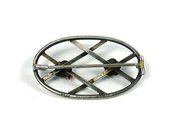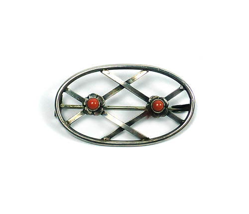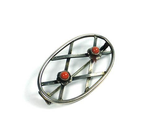 Offen gearbeiteter, quer-ovaler Silberkorpus (830er): ein schmaler Rahmen umschließt vier kreuzförmig angeordnete Stege, an deren Schnittpunkten zwei kleine, perlenartige Korallen-Cabochons in jeweils blütenförmig konfigurierter Zargenfassung fixiert sind. Maße ca. 4 x 2,3 cm, ungeputzter Zustand mit leichter Patina und geringen Tragespuren. Rückseitig einfache Nadelung sowie ungedeutete bzw. etwas verschlagene Markung ("H.U." oder "H.H."?). Wohl Dänemark der 1920er Jahre.