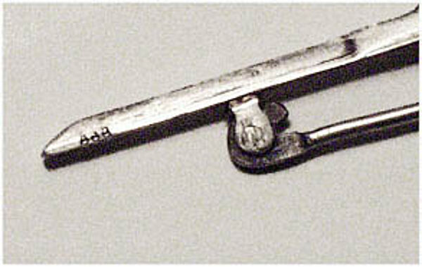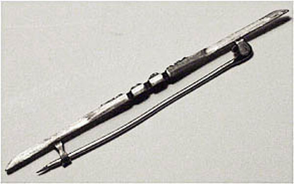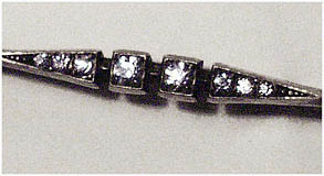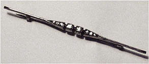 Länglicher, schmaler, an dem Enden spitz zulaufender Silberkorpus (835er), zentral befinden sich mehrere farblose, geschliffene Steine, deren zwei zentrale durch eine Taillierung vom Körper abgesetzt sind. Länge ca. 7 cm, ungeputzter Zustand. Rückseitig einfache Broschierung. Ungemarkt, wohl Deutschland der 20er Jahre.
