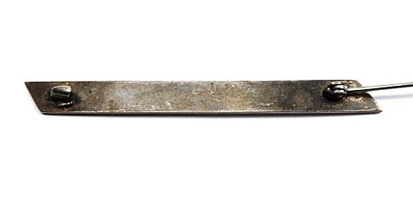 Bandförmiger Silberkorpus (geprüft), oberseitig martellierte Oberfläche. Länge ca. 6,6 cm, Breite ca. 0,6 cm, ungeputzter Zustand mit leichter Patina und geringen Tragespuren. Rückseitig einfache Broschierung. Ungemarkt, wohl Deutschland der 1920er, 30er.