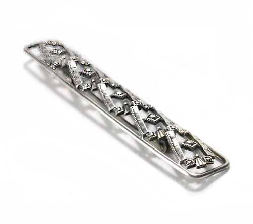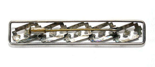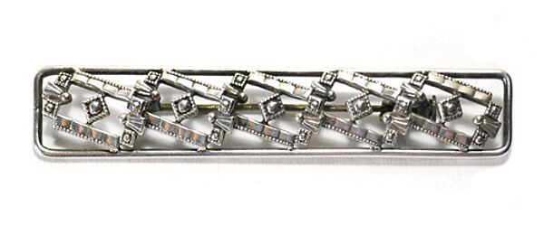 Bandförmiger, offen gearbeiteter Silberkorpus (800er): ein schmaler, stegartiger Rahmen umschließt fünf schräg gegeneiander gesetzte, rechteckige Elemente, die mit Markasiten besetzt sind. Länge ca. 6 cm, ungeputzter Zustand mit leichter Patina und geringen Tragespuren. Rückseitig einfache Broschierung, ungemarkt, wohl Deutschland der 20er, 30er Jahre.