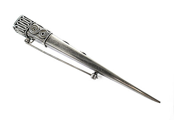Handgefertigter, langgestreckt-pyramidenförmiger Silberkorpus (geprüft) mit aufgelegten Spiral- und Schlaufenelementen, rückseitig Sicherheitsverschluss mit Kugelkopf. Länge ca. 10 cm, ungeputzter Zustand mit diskreter Patina und geringen Tragespuren. Ungemarkt, wohl 1910er, 20er Jahre.