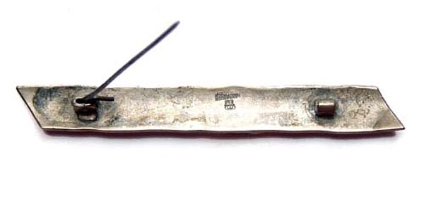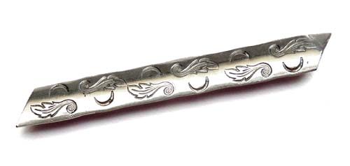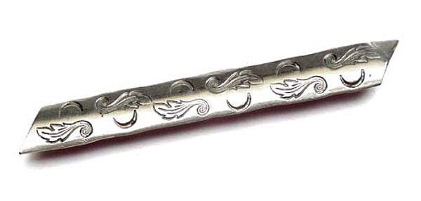 Bandförmiger, leicht konvex gewölbter Silberkorpus mit einfachem, gepunzten Blatt- und Sichel-Dekor. Maße ca. 7 cm x 0,8 cm. Rückseitig Markung "EM" unter Krone (ungedeutet) sowie Bezeichnung "Handarbeit". Wohl Deutschland der 20er, 30er Jahre.