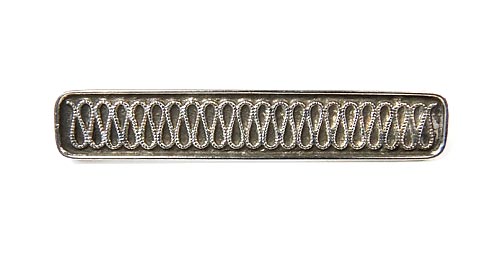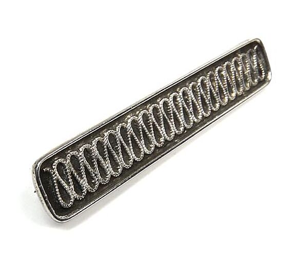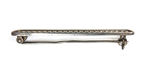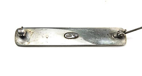 Bandförmiger Silberkorpus (835er) mit aufgesetztem Spiralband. Maße ca. 5,3 x 0,9 cm. Ungeputzter Zustand mit leichter Patina und geringen Tragespuren (Nadel leicht verbogen). Rückseitig Markung und Sicherheitsbroschierung mit Kugelkopf. Wohl 20er, 30er Jahre.