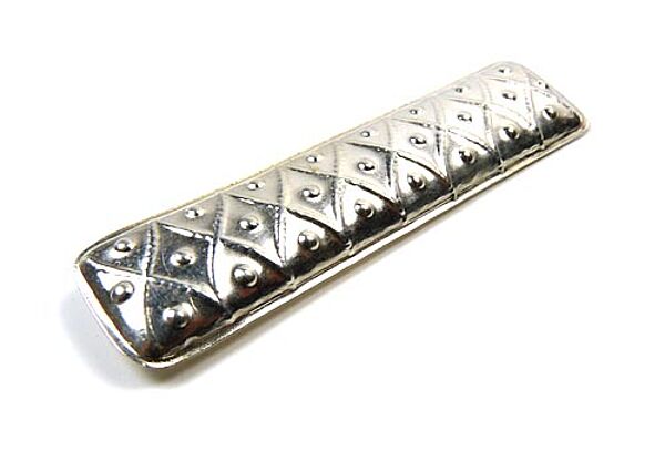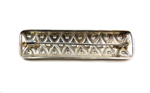 Bandförmiger Silberkorpus (835er) mit erhabenem Gitter- und Punktedekor. Maße: 6,1 x 1,5 cm, ungeputzter Zustand mit minimalen Tragespuren. Rückseitig Bezeichnung "HANDARBEIT" und einfache Broschierung. Wohl Deutschland der 20er, 30er Jahre.
