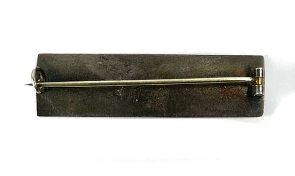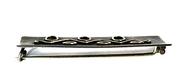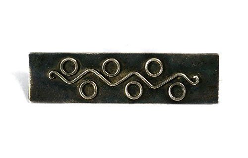 Handgefertiger, bandförmiger, leicht gemuldeter Silberkorpus (geprüft), vorderseitig aufgesetzte, feine Drähte, die ein abstraktes, grafisches Kreis- und Zackenliniendekor ergeben. Maße ca. 5 x 2,3 cm, ungeputzter Zustand mit dunkler Patina und geringen Tragespuren. Rückseitig einfache Broschierung. Unbezeichnet, wohl Deutschland der 1920er, 30er Jahre.