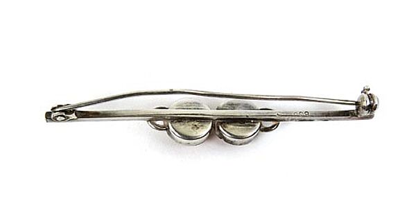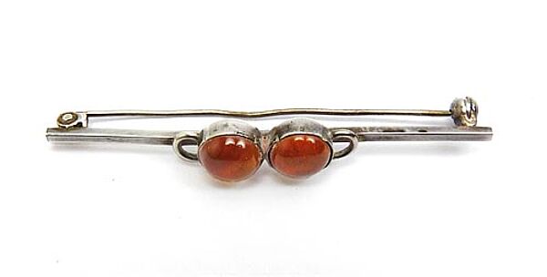 Silberner (835er), nadelförmiger Korpus, der zentral zwei runde, orange-bräunliche, luzide Bernsteincabochons in Zargenfassung trägt, diese werden seitlich jeweils von einem kleinen, schlaufenförmigen Element flankiert. Länge ca. 6 cm, ungeputzter Zustand mit geringen bis moderaten Tragespuren, so ist die Nadel der Sicherheitsbroschierung (mit Kugelkopf) leicht verbogen. Wohl 20er, 30er Jahre.