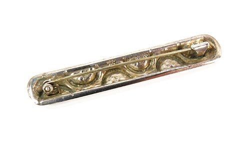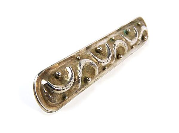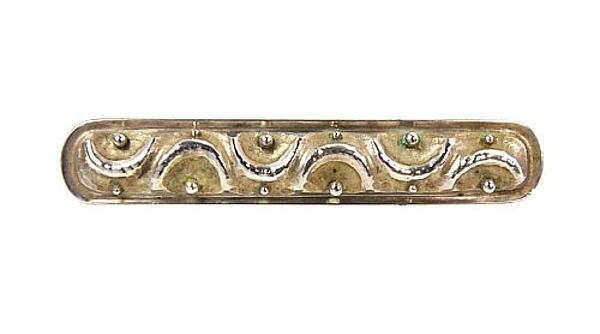 Handgetriebener, bandförmiger, leicht konver Silberkorpus (835er) mit abgerundeten Ecken, plastisch ausgearbeiteten Bogen- und aufgesetzten Kugelelementen. Maße ca. 5,8 x 1 cm, ungeputzter Zustand mit leichter Patina und geringe Tragespuren. Rückseitig Bezeichnung "Handarbeit" und einfache Broschierung. Wohl Deutschland der 20er, 30er Jahre.